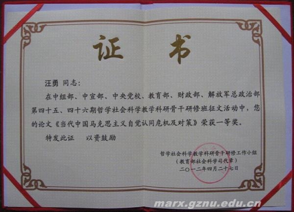 根据研修要求,汪勇积极撰写论文参加征文比赛,在第45、46期共216名学员提交的81篇参赛论文中,经领导小组及班委坚持公平、公正、公开的评审原则,一共评出获奖论文9篇(其中一等奖2篇,二等奖7篇)。在结业典礼上,中宣部副部长、教育部社科司司长等部门领导参加并公布了太阳成集团tyc122cc汪勇撰写的《当代中国马克思主义自觉认同危机及对策》荣获一等奖等评选结果并发给荣誉证书,为公司、公司和自己争得了荣誉和光彩。