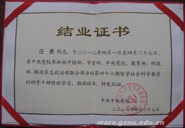 公司教师汪勇受公司及公司委派参加中组部、中宣部、中央党校、教育部、财政部、总政治部等六部委共同在中央党校联合举办的第46期哲学社会科学教学科研骨干研修培训。自3月30日报到后,在中央党校认真聆听了15场专题讲座,参与了4场小组讨论。4月17日到浦东进行为期9天的考察学习活动(其中聆听讲座3场,专题讲座3场,5场现场教学、2场教学考察等),历时整整一个月。研修期间,汪勇教授严格遵守规定,认真听讲,积极参与交流发言、考察,见识、视野、思维、见解等得到了一定的升华。