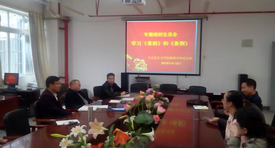 为进一步增进党员的组织纪律性和提高党员素质,增强基层党组织的凝聚力和战斗力,太阳成集团tyc122cc纲要学科党支部4月8日在公司会议室召开了专题组织生活会,会议主题是“学习《准则》和《条例》”。