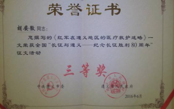 此次研讨会是在“长征与遵义——纪念长征胜利80周年”征文活动基础上举办的。征文面向全国,共评出一等奖2名、二等奖5名、三等奖10名,优秀奖31名。公司胡安徽博士提交的论文《红军在遵义地区的医疗救护述略》获三等奖。本次会议由来自中央党史研究室和中央文献研究室的领导、老一辈革命家后代、评审专家、论文作者代表、省内外专家和党史部门代表等近百人出席。老一辈革命家后代罗东进(罗荣桓元帅之子)、刘建(朱德元帅外孙)、李洋(李忠权将军之子),以及中央党史研究室副主任冯俊、贵州省委党史研究室主任杜丹等在大会上作了讲话。公司胡安徽博士作为论文获奖代表在大会上作了“红军在遵义地区医疗救护的再思考”主题发言。