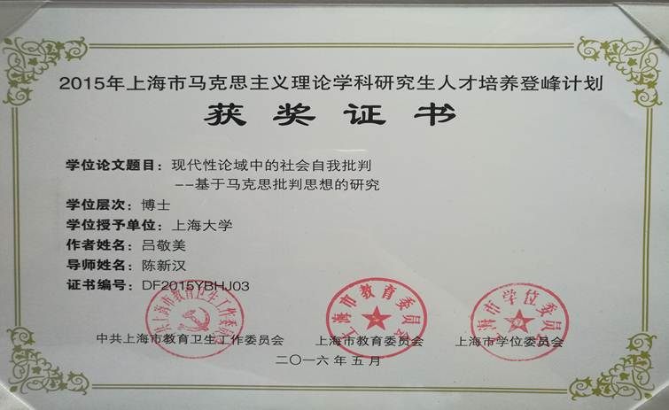 日前,中共上海市教育卫生工作委员会、上海市教育委员会、上海市学位委员会办公室公布了《2015年上海市马克思主义理论学科研究生人才培养“登峰计划”入选名单》,公司教师吕敬美博士的博士学位论文入选其中,其导师为陈新汉教授。“登峰计划”是加强和推进上海市马克思主义理论学科研究生人才培养的重要举措,体现了公司及学科点人才培养的质量和水平,在上海市乃至全国研究生人才培养领域有广泛的影响。2015年“登峰计划”共有4位博士和6位硕士入选。