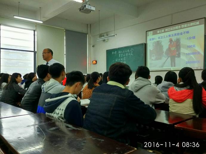 11月4日,“思想道德修养与法律基础”学科组在花溪校区GJ3313教室成功举行了院级公开课。本次公开课由杨席宇博士主讲,授课内容为“树立法治观念,尊重法律权威”。 集团督导组老师郑志平、胡泽尧、章凤红,以及公司部分老师观摩了公开课。