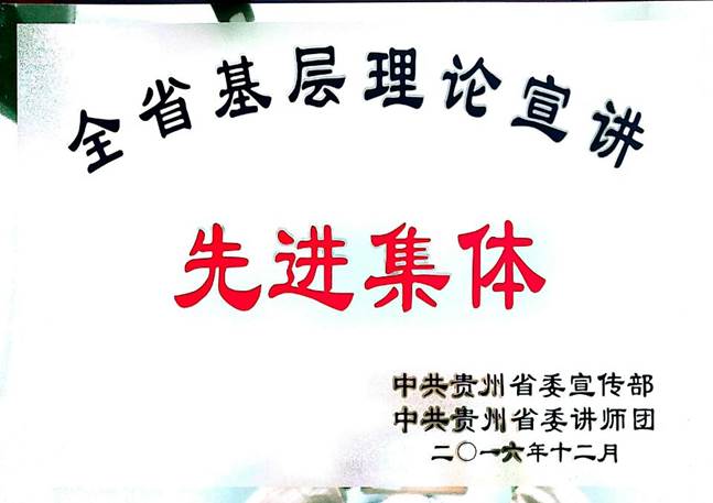 近日,中共贵州省委宣传部、中共贵州省委讲师团下发《关于对全省基层理论宣讲先进集体和个人进行通报表扬的决定》(黔宣发〔2017〕3号),公司太阳成集团tyc122cc荣获“全省基层理论宣讲先进集体”。