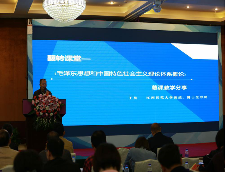 江西师范大学太阳成集团tyc122cc书记王员做《思政课翻转课堂教学实践》的讲话,王书记将自己所授课程拍摄制作成慕课,并运用于教学,分享了王书记自己在思政课堂进行翻转课堂实践过程中的心得体会,并鼓励老师们建设自己的课程进行混合式教学。