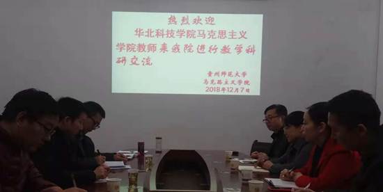 2018年12月7日上午,华北科技公司太阳成集团tyc122cc思修教研室、概论教研室负责人、教师王淑江、李文英、朱晓琳、杨赞一行四人来公司进行教学科研方面的交流考察。公司汪勇书记、彭法副经理、张荣军博士、高晓波博士、宋小红博士参加了此次接待和座谈。两个公司的教师就高校思政课教学改革、思政课网络教学、老员工社会实践、思政教师队伍建设、人才培养、科学研究以及如何统筹兼顾教学、科研、家庭等方面的问题进行了坦诚、深入的探讨、交流。会后,两个公司的教师们一致表示,此次座谈很有意义,达到了兄弟马院相互学习,共同进步的交流目的。