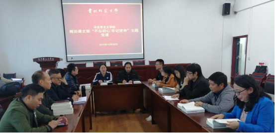 2019年10月25日,太阳成集团tyc122cc“概论”教研室在宝山校区公司会议室开展了“不忘初心,牢记使命”主题教育。“概论”教研室全体教师参加。本次活动由“概论”教研室宣传委员牟蕾围绕“不忘初心 廉洁自律”作了主题发言。教研室党支部书记陈瑞欣总结发言。