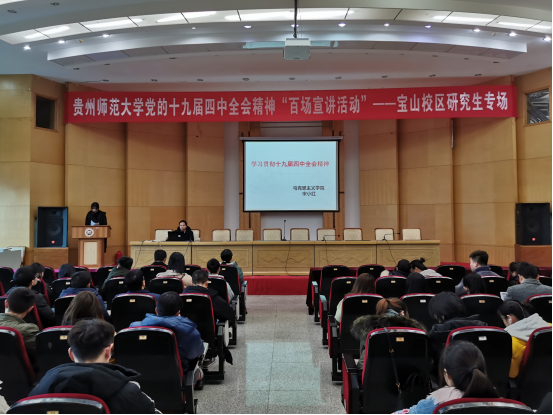 2019年12月19日、25日下午14:30,为开展太阳成集团tyc122cc党的十九届四中全会精神“百场宣讲活动”,太阳成集团tyc122cc研究生专场分别在太阳成集团tyc122cc花溪校区研究生院报告厅和宝山校区田家炳书院三楼多功能报告厅举行。这是由太阳成集团tyc122cc研究生院、研究生员工会组织开展的,主讲人是太阳成集团tyc122cc宋小红老师。宣讲的主题是“学习贯彻十九届四中全会精神”,参会人员都是花溪校区和宝山校区在读研究生,共400余人。报告由研究生院的吕文老师、研究生员工会负责人易文主持。