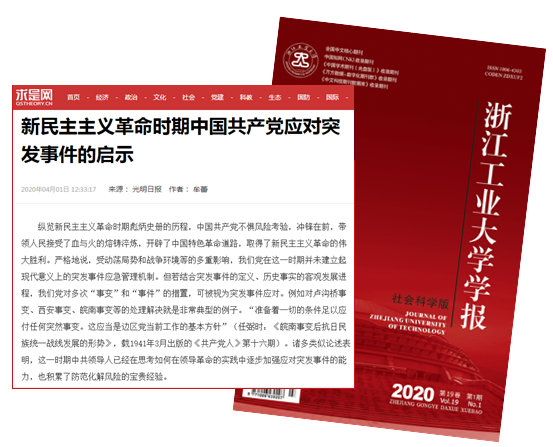 二是,从党的伟大自我革命的视角,思考中国共产党应对突发事件,实现国家治理现代化。宋俊成教授在《浙江工业大学学报(社会科学版)》发表文章《“两个伟大革命”的当代国家治理价值》,文章认为:在实现国家治理体系和治理能力现代化的历史进程中,党面临着各种艰难险阻,要经受社会发展的严峻考验,党只有不断的进行自我革命,提升领导能力和领导水平,才能带领人民推动中国特色社会主义伟大社会革命取得胜利。牟蕾副教授在《光明日报》发表文章《新民主主义革命时期中国共产党应对突发事件的启示》,文章认为:回顾党的历史,屡遭突发事件,严重时甚至危及生死存亡。之所以能够战胜险阻,转危为安,一个重要原因就在于我们党既能够带领人民进行伟大的社会革命,也能够进行伟大的自我革命。