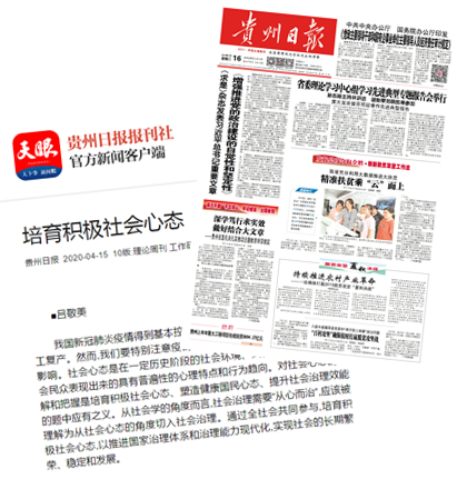 三是,基于新冠肺炎疫情防控持续向好的角度,分析中国特色社会主义社会治理之路。吕敬美博士在《贵州日报》发表文章《培育积极社会心态》,文章认为:从国际层面而言,某些西方国家和反华势力借助疫情对党和国家无端指摘、蓄意“甩锅”,其立足点就是通过大众媒介对我国民众社会心态进行渗透;从国内层面而言,疫情一定范围内导致了对特定地方人群的污名化;部分人热衷于传播小道信息,不相信主流渠道发布的信息等等,这些不良社会心态对于疫情防控会带来消极影响。因此,培育自尊自信、理性平和、积极向上的社会心态,加强社会主义意识形态话语权和领导权,对于推动中华民族的伟大复兴、建构人类命运共同体至关重要。