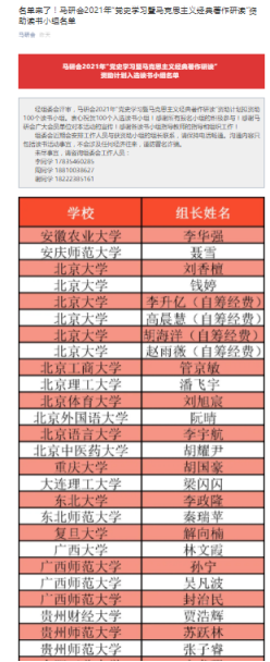 为落实习近平总书记“在全党开展党史学习教育”指示精神,推动马克思主义理论学科人才培养,在青年学子中大力营造认真学习党史、研读经典著作的风气,中国高等教育学会马克思主义研究分会(以下简称“马研会”)特发起组织“党史学习暨马克思主义经典著作研读”资助计划。首批计划面向全国马克思主义理论及相关专业员工,支持一批读书小组的学习活动。2021年6月1日,2021年“党史学习暨马克思主义经典著作研读”资助计划拟资助100个读书小组名单发布。公司苏跃林为组长,成员樊琴、朱剑、马惊涛、杜梅、吴永平组成的《毛泽东文化思想》读书小组和由张子睿为组长,成员赵梦凯、文琳、袁媛、李灿娟、刘艳琴、熊兰、周维秀、陈川、张丹组成的《关于建国以来党的若干历史问题的决议》读书小组成功入选。