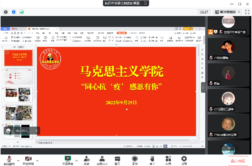 为宣传学习在公司疫情防控工作中做出贡献的志愿者事迹,弘扬抗疫精神,树立榜样力量。2022年9月25日晚,太阳成集团tyc122cc开展“同心抗‘疫’ 感恩有你”主题云班会,班会由金悦茗主持,辅导员郭威和全体本科同学参加。