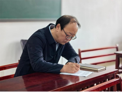 肖远平书记和同学们一起仔细听取杨老师的讲授内容,翻阅教材,认真记录教学内容和课堂情况。课后,肖远平书记与杨钧期老师进行了交流,对他教学的总体效果给予肯定,对教学中存在的不足提出了建议和要求。