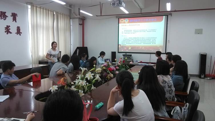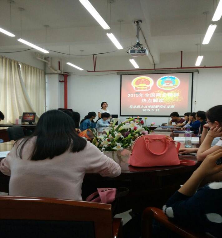 首先,研究生党支部书记彭羽同学以PPT的形式,从两会精神的三个方面为大家做了详细的阐述,主要是1、什么是两会,22015年的工作报告,32015年两会热点等。