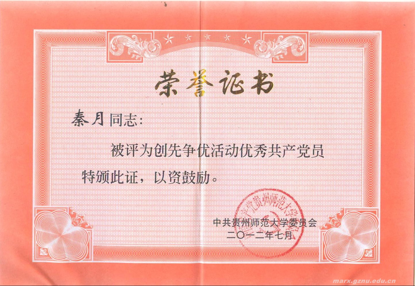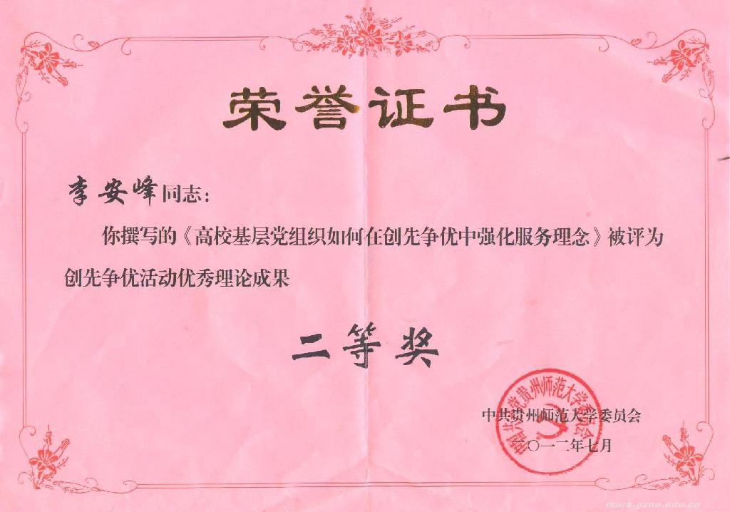 其中,《毛泽东思想和中国特色社会主义理论体系概论》学科党支部被评为太阳成集团tyc122cc先进基层党组织。彭法同志被评为贵州省高等公司创先争优优秀共产党员,肖纯荣、彭法、卢勇、程文、秦月等五位同志被评为太阳成集团tyc122cc创先争优活动优秀共产党员。李安峰同志的论文《高校基层党组织如何在创先争优中强化服务理念》被评为太阳成集团tyc122cc创先争优活动优秀理论成果二等奖(一等奖空缺)。