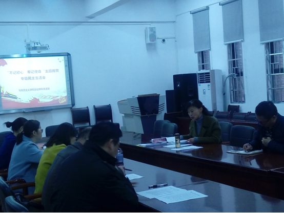 会议的第一项议程是党支部书记章凤红教授介绍了“不忘初心、牢记使命”专题组织生活会的目的、意义和要求。章凤红教授结合自己的学习体会,提出支部全体成员要讲学习、干实事,深入学习贯彻党的十九届四中全会精神,立足本职岗位,积极搞好教学科研工作;要讲政治、顾大局,不断增强“四个意识”,坚定“四个自信”,做到“两个维护”;要讲责任、敢担当,把敬业奉献作为一种政治品格,牢记全心全意为人民服务的根本宗旨,敢于担当作为。