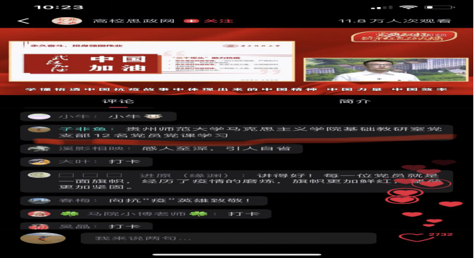 在课后,基础学科党支部召开了学习生活交流会。老师们认为:示范微党课充分应用了现代科技,为更好应用现代科技开展思政课教学提供了良好示范;讲课老师展现了许多高校组织战“疫”的生动实例,很生动很感人,可以作为教学案例应用到今后的思想政治课教学中;自身教学与教学技术的发展要求有差距,要进一步提高现代教育技术水平;网络教学要继续做细做实“停课不停学”有关工作如解决师生互动、学习反馈等;要适应教材、现实的转变,把思想政治教育贯穿疫情防控全过程。最后,支部书记章凤红结合基础学科的教学,提出要立足教材,结合战“疫”,创新新时代爱国主义教育,汇聚众志成城、共克时艰的“红心”战“疫”力量,让党旗在防控疫情斗争第一线高高飘扬。